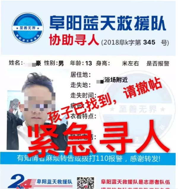 8日(昨晚)23时许,阜阳蓝天救援队接到市民求助,称自己的孩子留下一封遗书后就不见了。救援队组织队员赶赴男孩走失地,阜城某浴场附近紧急集合搜寻。救援人员分成三组,一组人员发布寻人启事,一组与其家人调看附近监控,另一组人员则是与警方在附近网吧与危险区域搜寻。