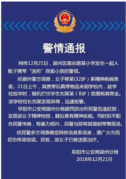 12月21日,颍州警方接到报警电话,并迅速赶往现场。警方经过调查发现,精神疾病患者程某(32岁,女)携带玩具等物品来到学校内,趁学校放学时,随机拦住学生刘某某( 8岁)意图将其带走。该学校校长刘某发现异常,迅速报警。